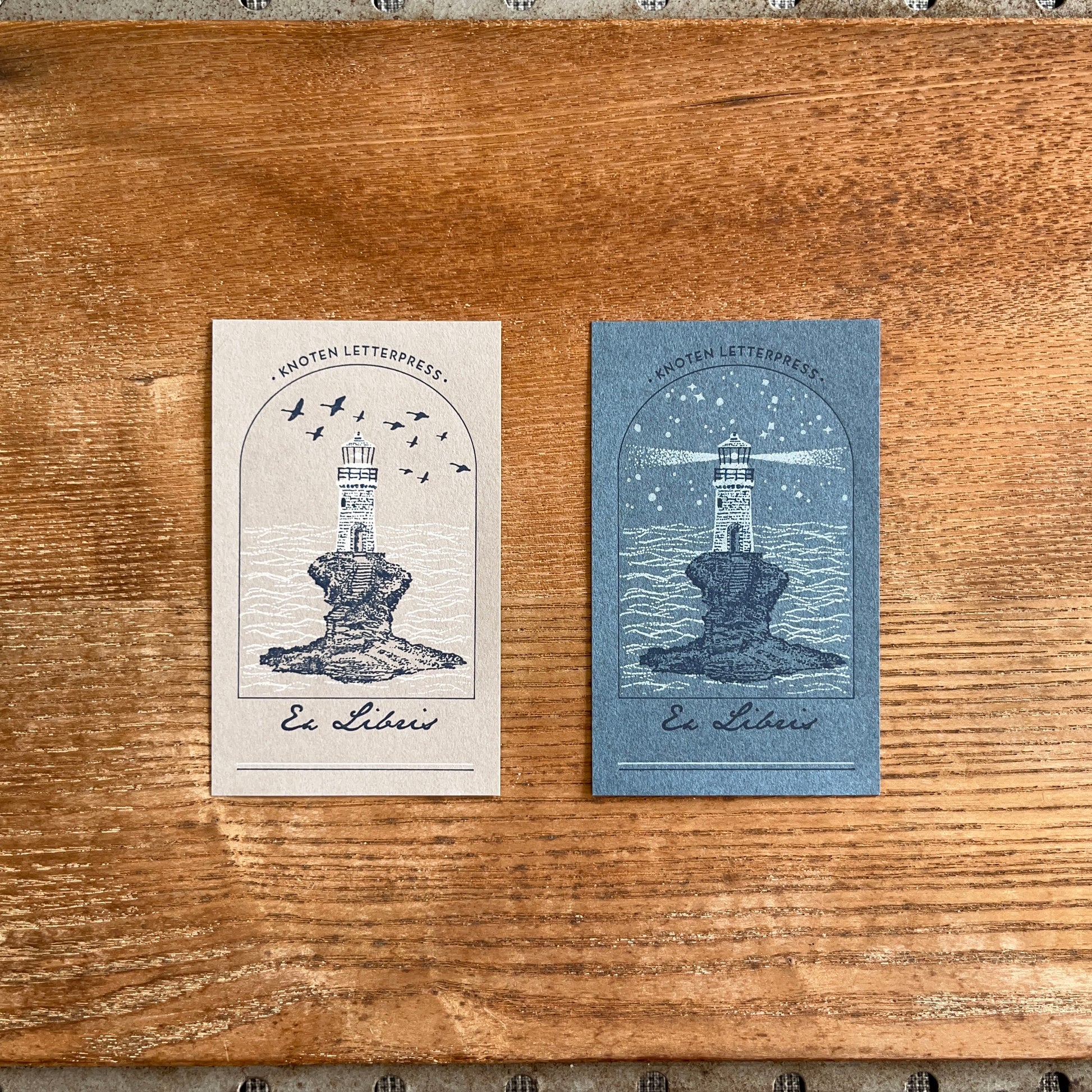 A set of letterpress bookplates featuring a lighthouse standing on a small island. The set includes two designs: one showing the calm sea during the day, and the other a starry sky at night, printed on gray and deep blue paper. The delicate lines and warm texture of letterpress printing make these perfect for marking your favorite books or decorating your journal pages.