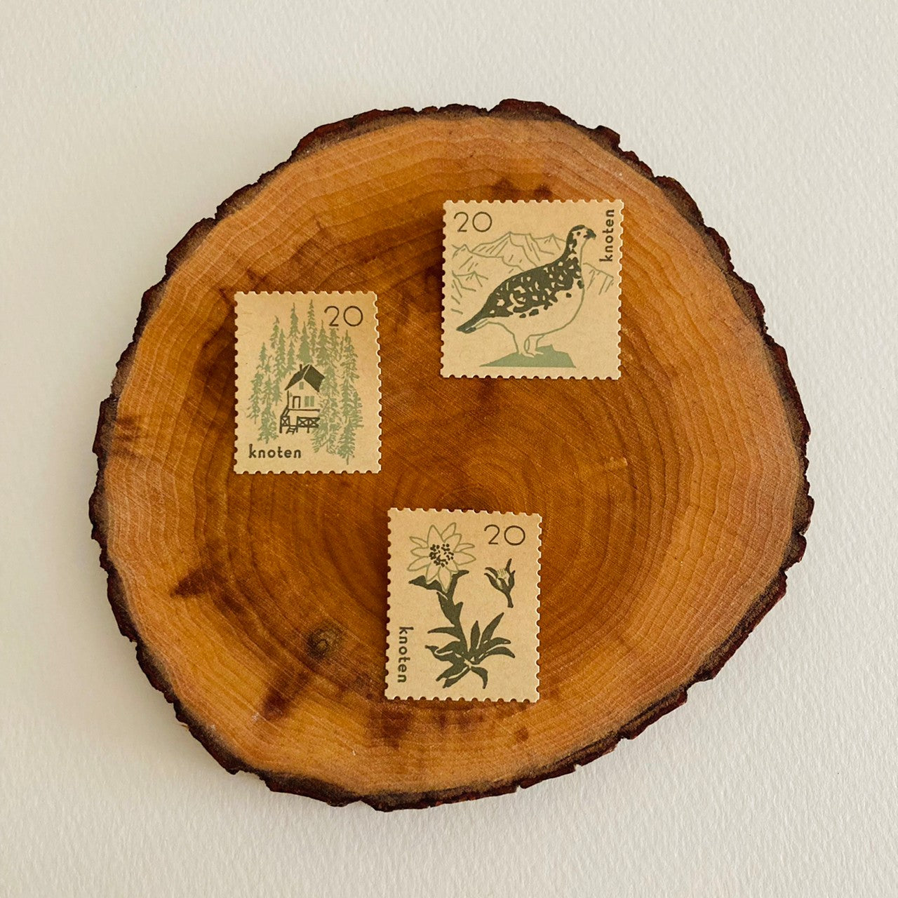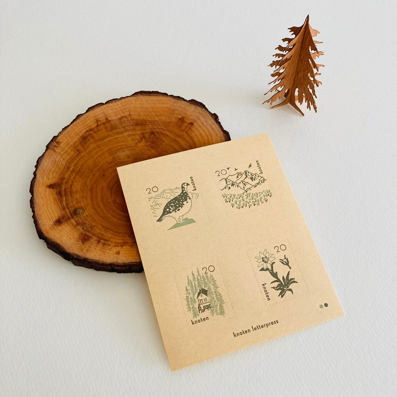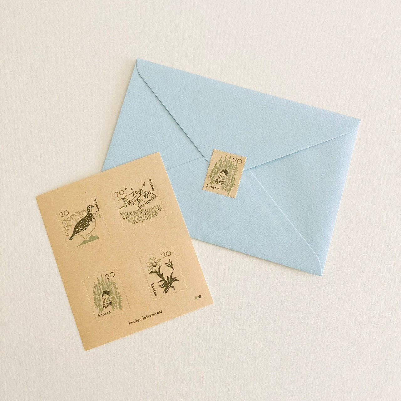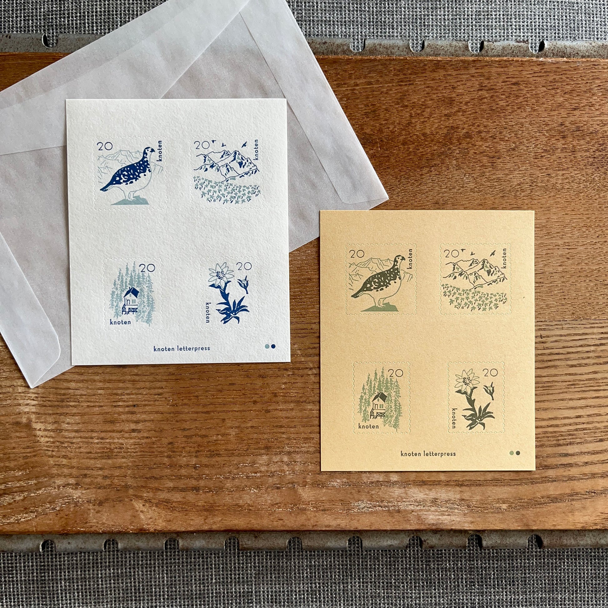 A postage stamp-style sticker set featuring majestic mountains and the life around them. Animals and plants living in the mountains are delicately depicted in calm tones. Printed on soft white cotton paper and light brown kraft paper, each with a different mood. Comes with a glassine envelope. Also ideal for natural-themed gifts!