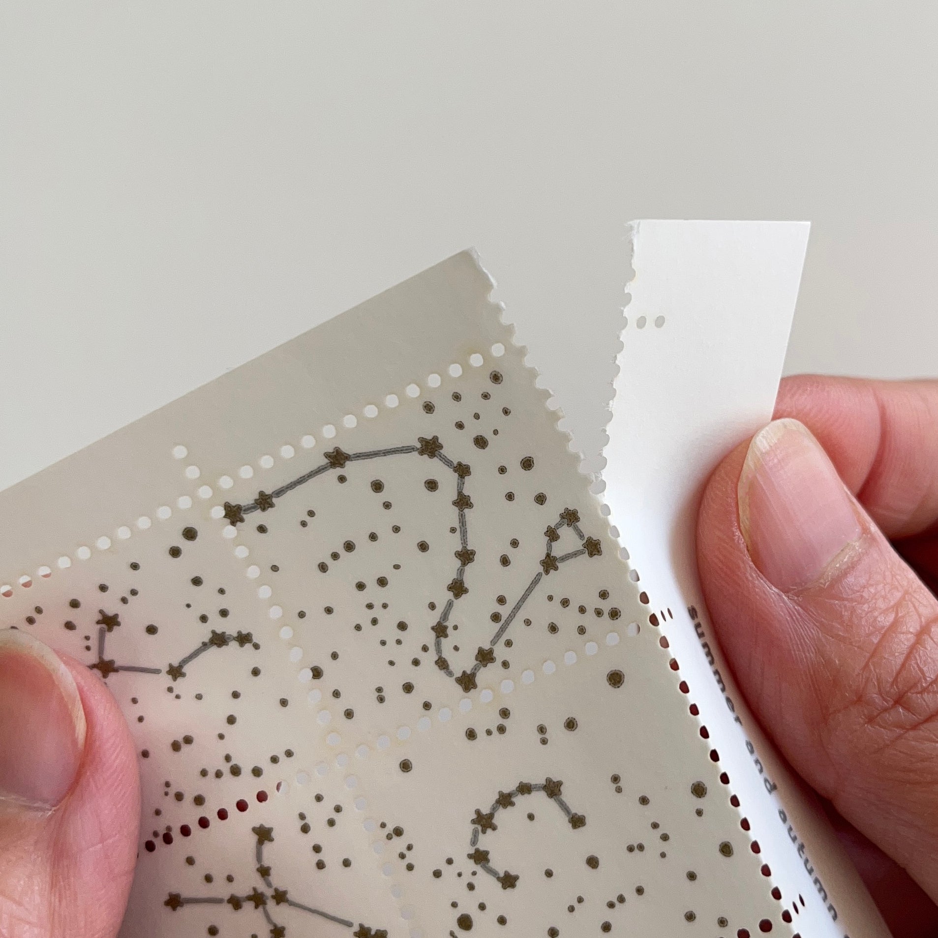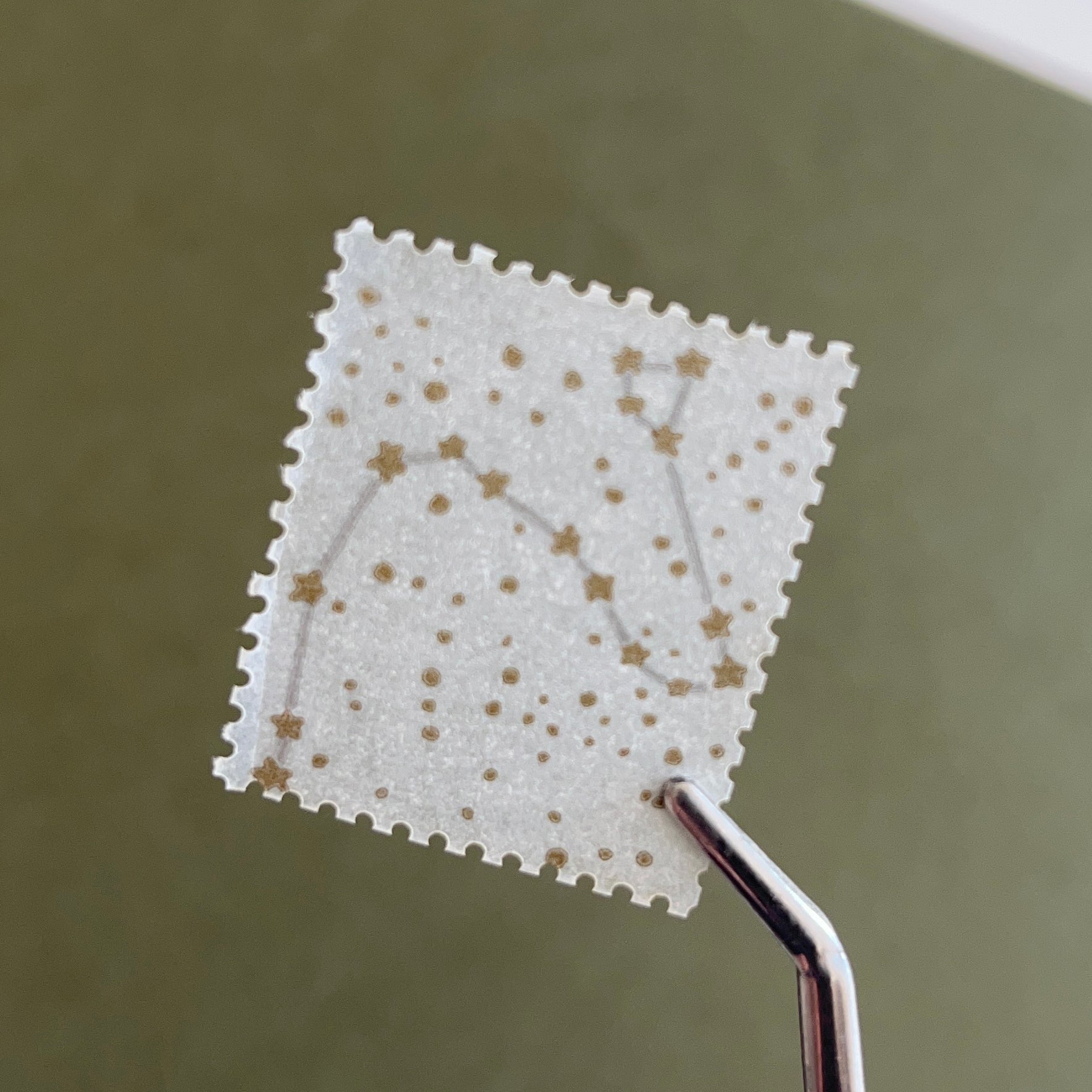 A postage stamp-style sticker sheet featuring the constellations of winter and spring. The stars are delicately printed in gold and silver ink on semi-transparent tracing paper, with perforations that allow you to tear them off like vintage stamps. Perfect for decorating letters, journals, and seasonal gifts.