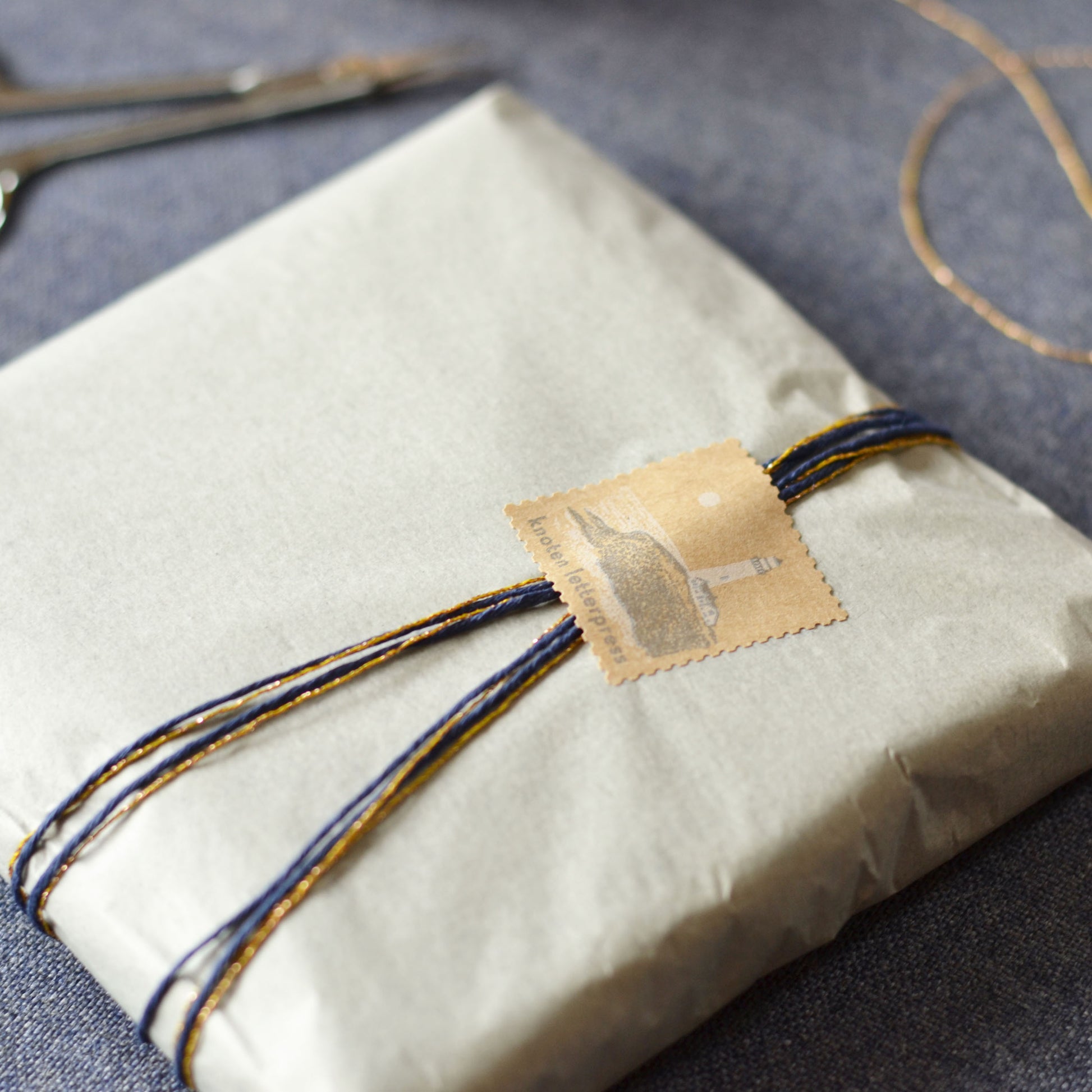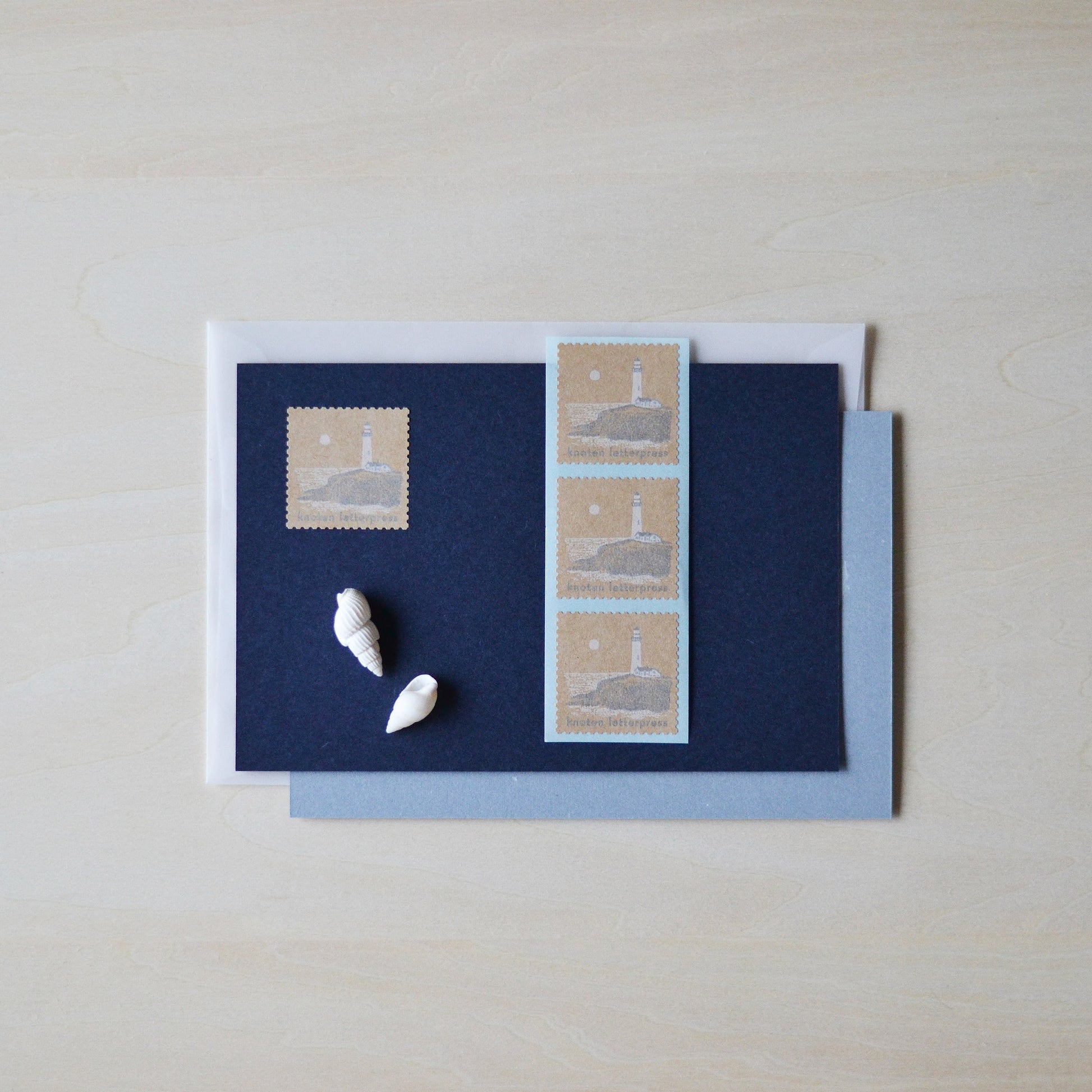 A postage stamp-style sealing sticker featuring a lighthouse standing by the sea. Printed in silver and white ink on kraft paper, this design gently captures the quiet scene of a lighthouse on a moonlit night. Its natural texture makes it a perfect match for letters and gifts.