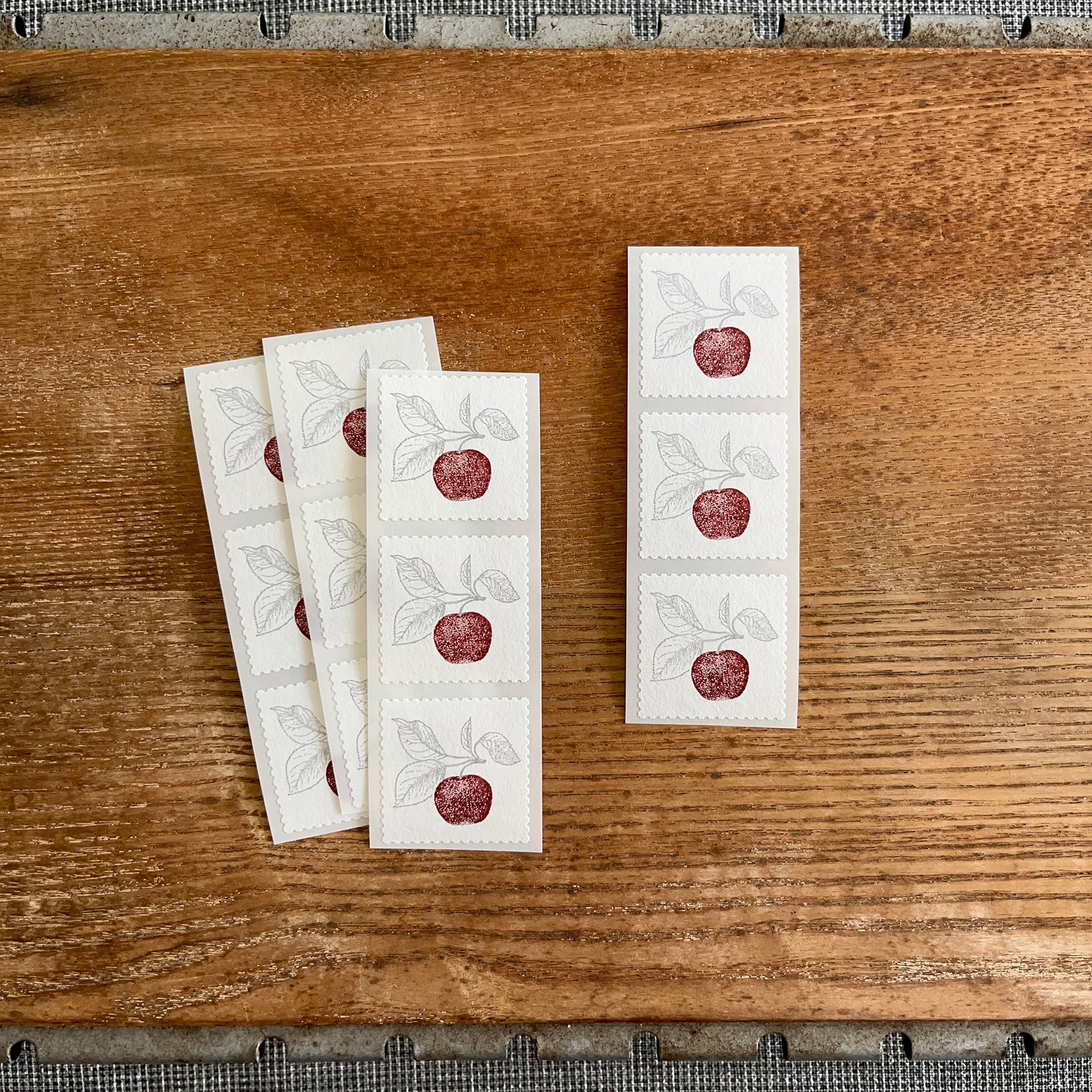 A sealing sticker featuring a red apple and delicate leaves. Printed in deep red on cotton paper, it delivers the gentle charm unique to letterpress printing. Perfect for adding a seasonal accent to gifts and letters.
