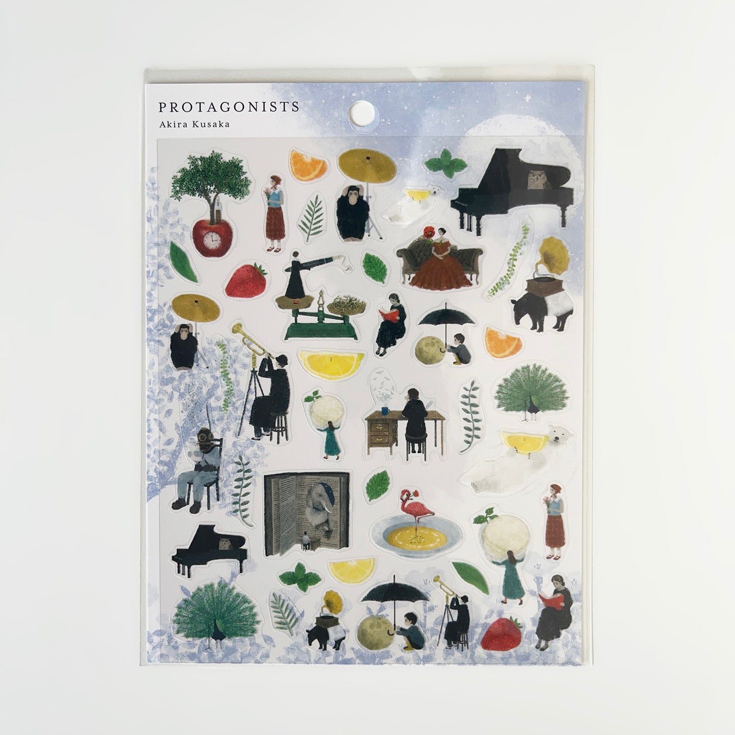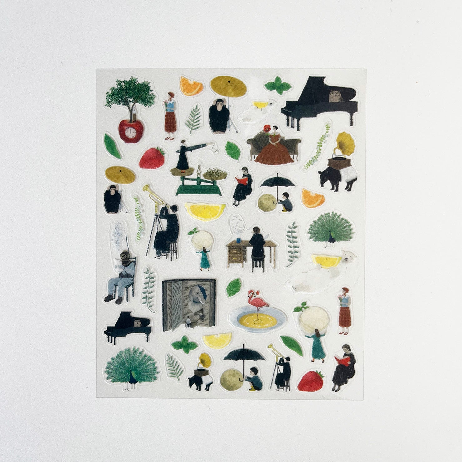 True to its name, PROTAGONISTS features a cast of characters that seem to step out of unseen stories. Each illustration invites you to imagine the scenes behind them, with a dreamlike charm and quiet elegance. Musical instruments are also scattered throughout—perfect for those who find inspiration in sound. The sheet is sized to tuck neatly into an A5 notebook. Use the larger stickers as accents on notebooks or accessories, and the smaller ones for journals or planners. Printed on clear PET, they blend seamlessly onto any surface.