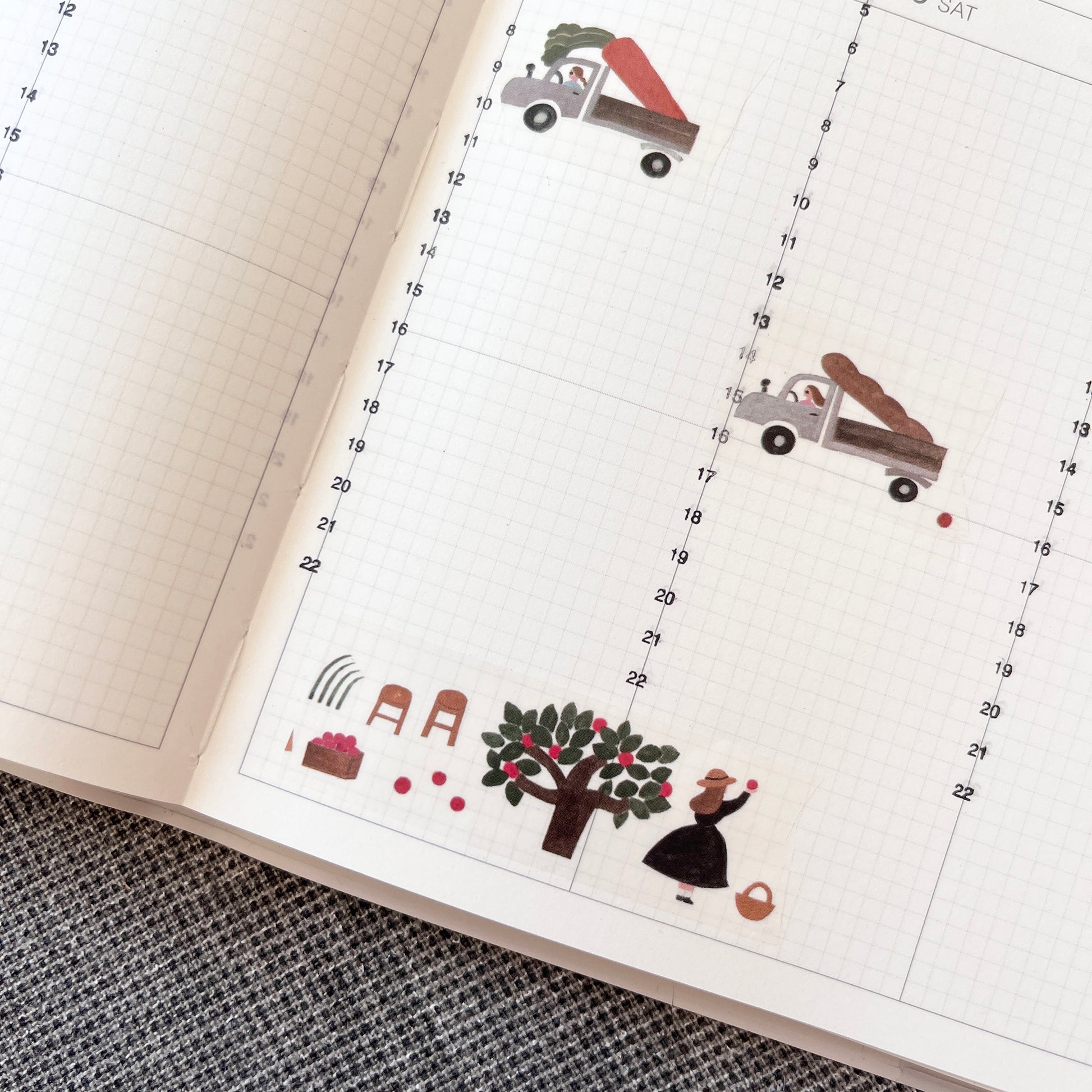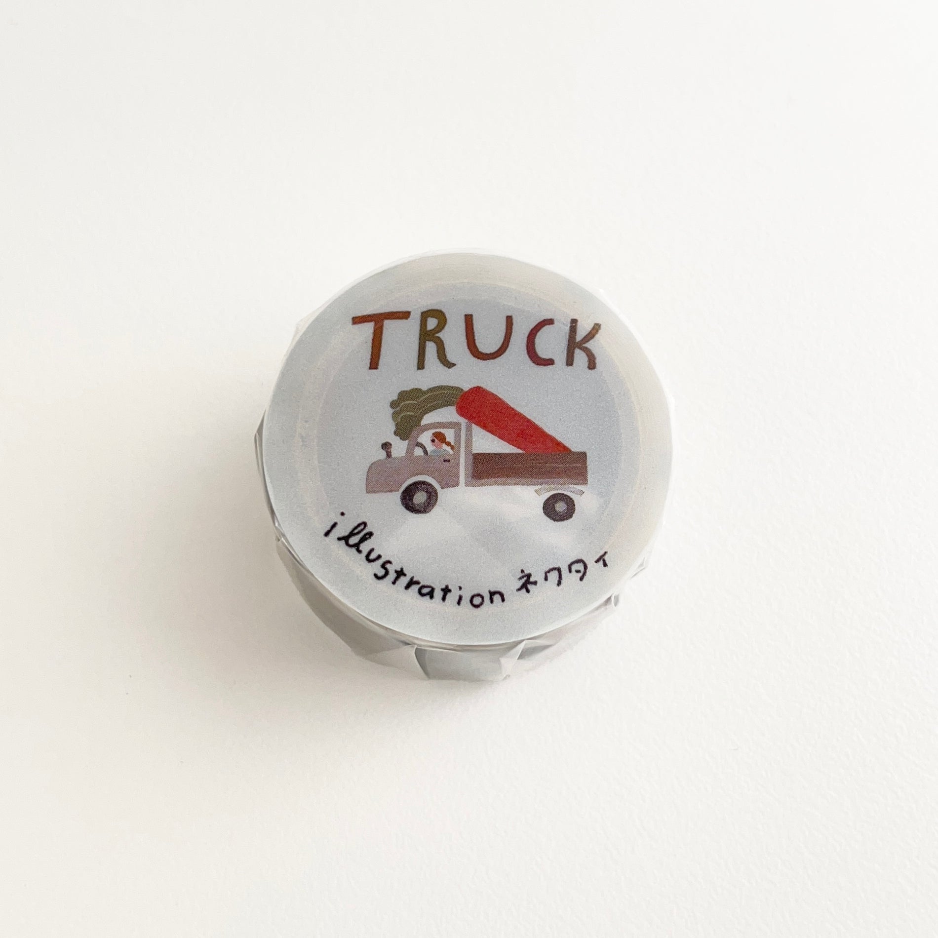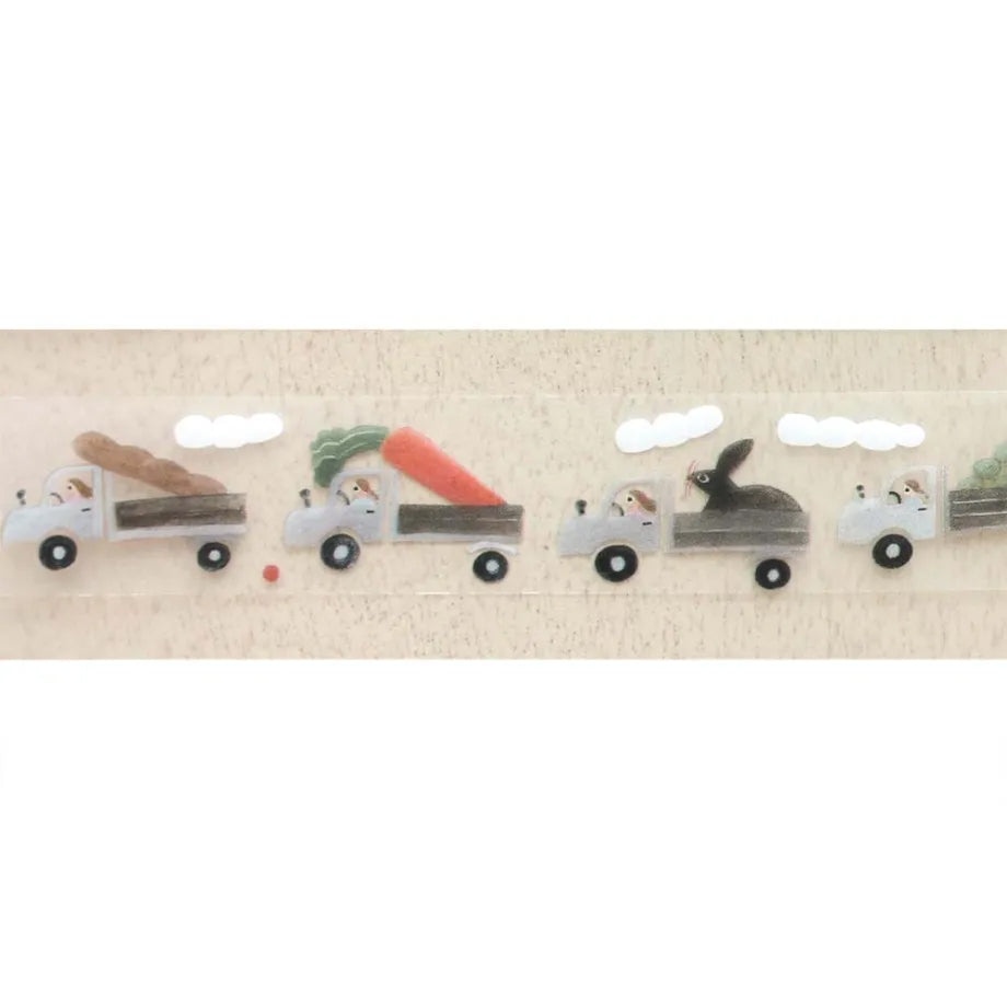 A whimsical clear masking tape featuring trucks carrying all sorts of things—bread, carrots, rabbits, even a giant hat! Designed by the illustrator necktie, this tape is full of playful charm. Don’t miss the puffy little clouds drifting above the trucks!