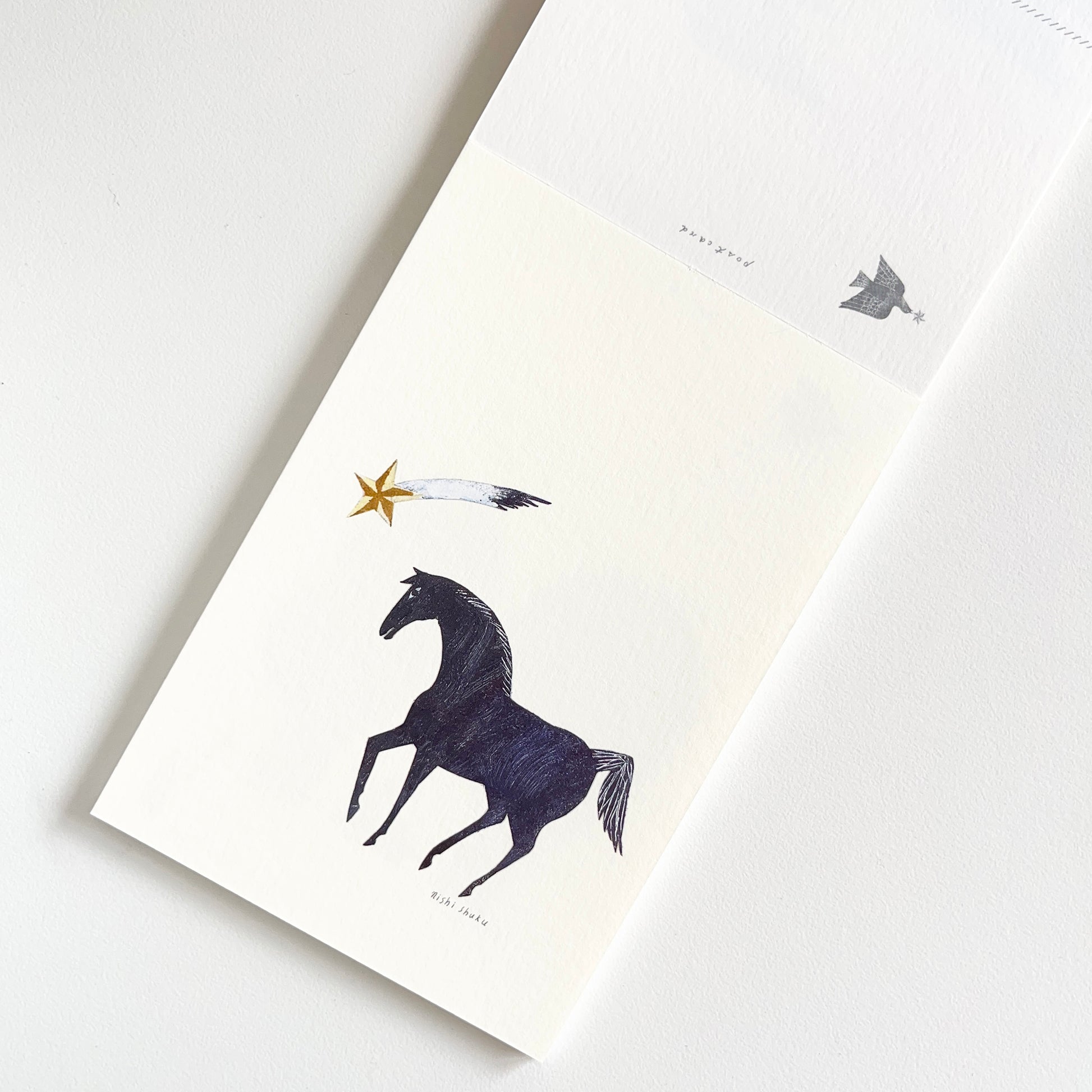 A beautifully serene postcard set by illustrator Nishi Shuku, where quiet landscapes and animals meet the magic of the night sky.