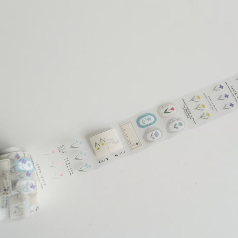 This roll sticker is filled with a mix of floral motifs, all arranged within a 40 mm width. Every sticker is pre-cut, so you can peel and use each one right away. Tiny flowers, decorative elements, and text designs add a soft “yohaku” feel that works beautifully for collages.
