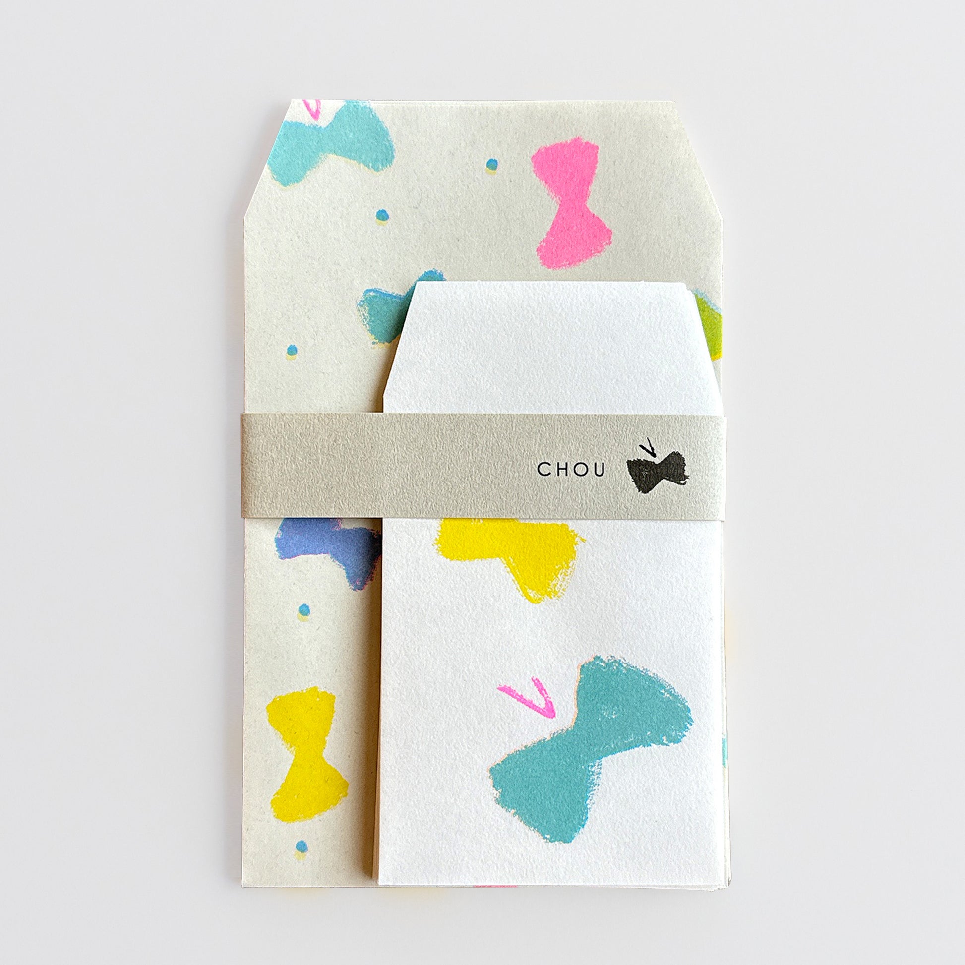These paper bags are scattered with colorful and fluffy butterflies expressed by multiplying three colors. The slightly nostalgic atmosphere unique to riso- printing matches well with the tasteful straw paper and white paper. The package contains 5 sheets of each of two sizes, large and small, so you can use them as a small gift or for sharing with others, depending on your purpose.