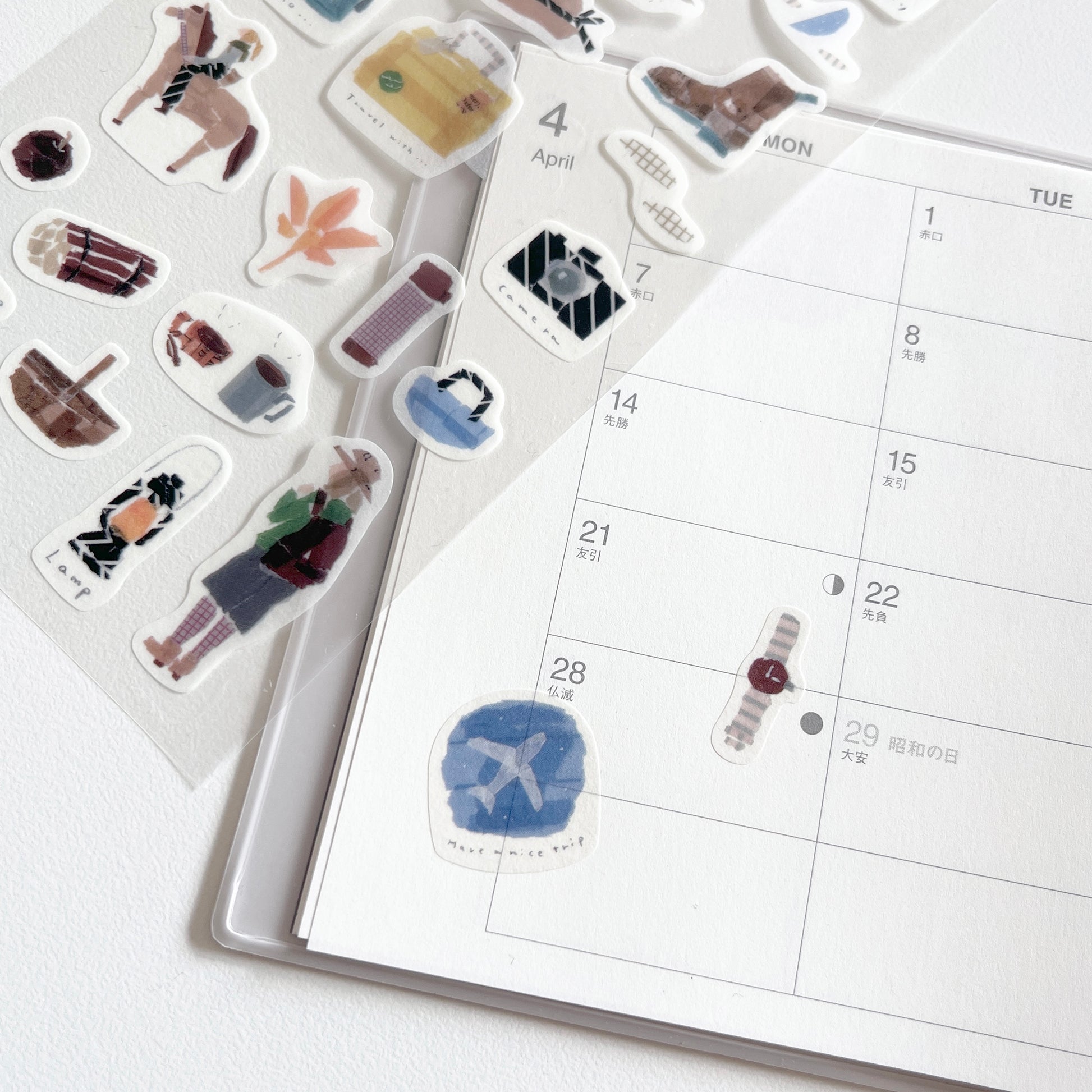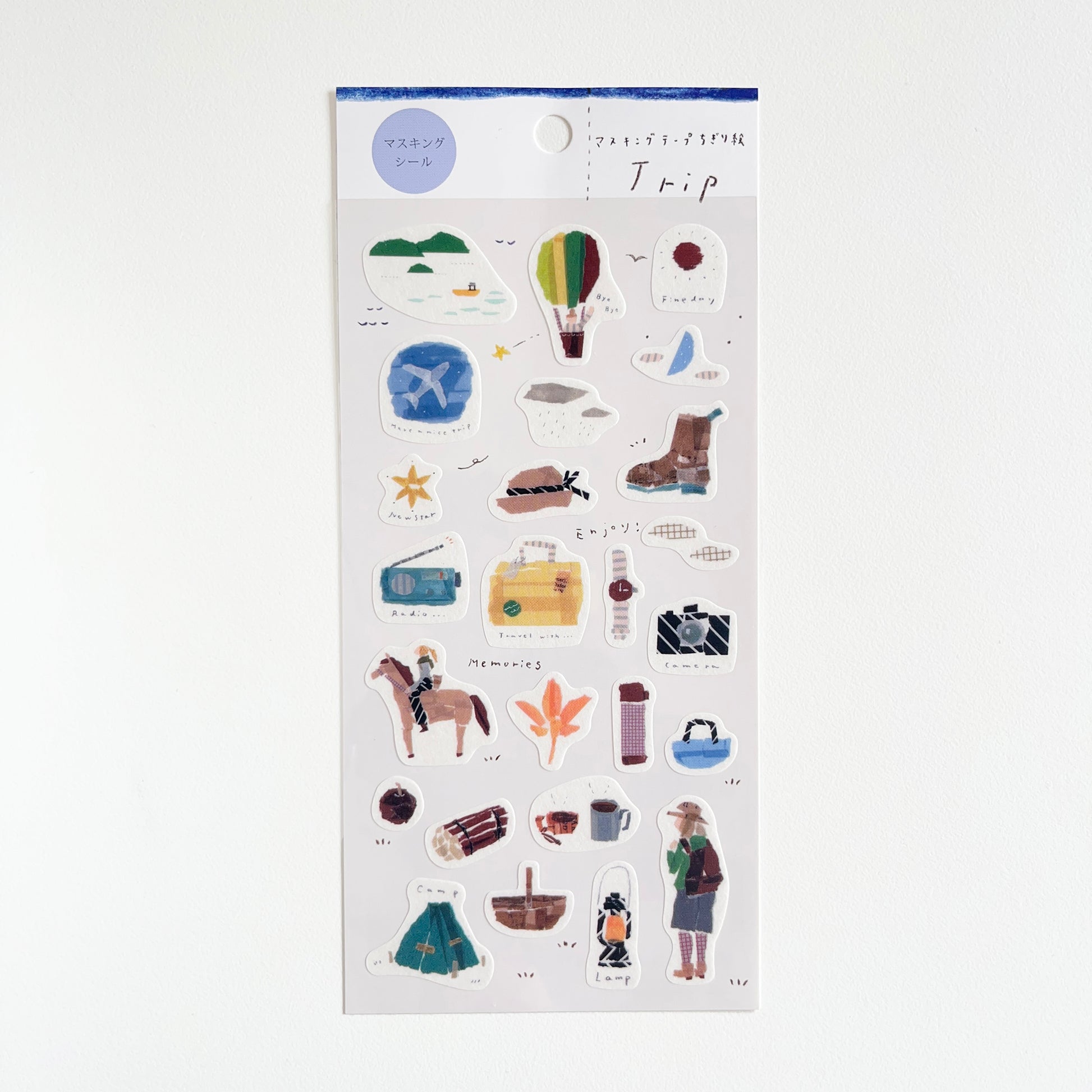 This sheet is themed around travel—gentle illustrations that invite you to imagine little adventures. Made from washi masking tape, the stickers blend naturally with your page and are perfect for journaling, decorating letters, or collages.