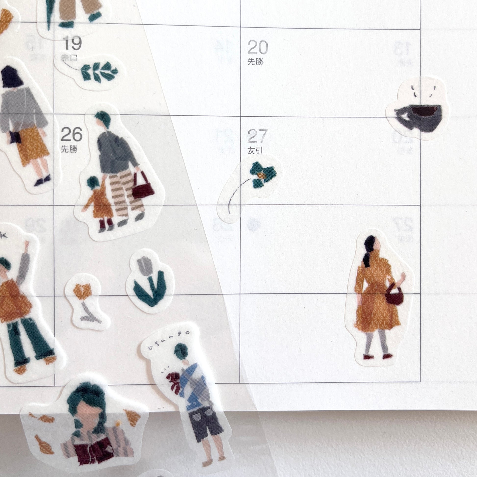 This sheet depicts everyday moments, people strolling, shopping, relaxing..., capturing the calm rhythm of daily life. Made from washi masking tape, the stickers blend naturally with your page and are perfect for journaling, decorating letters, or collages.