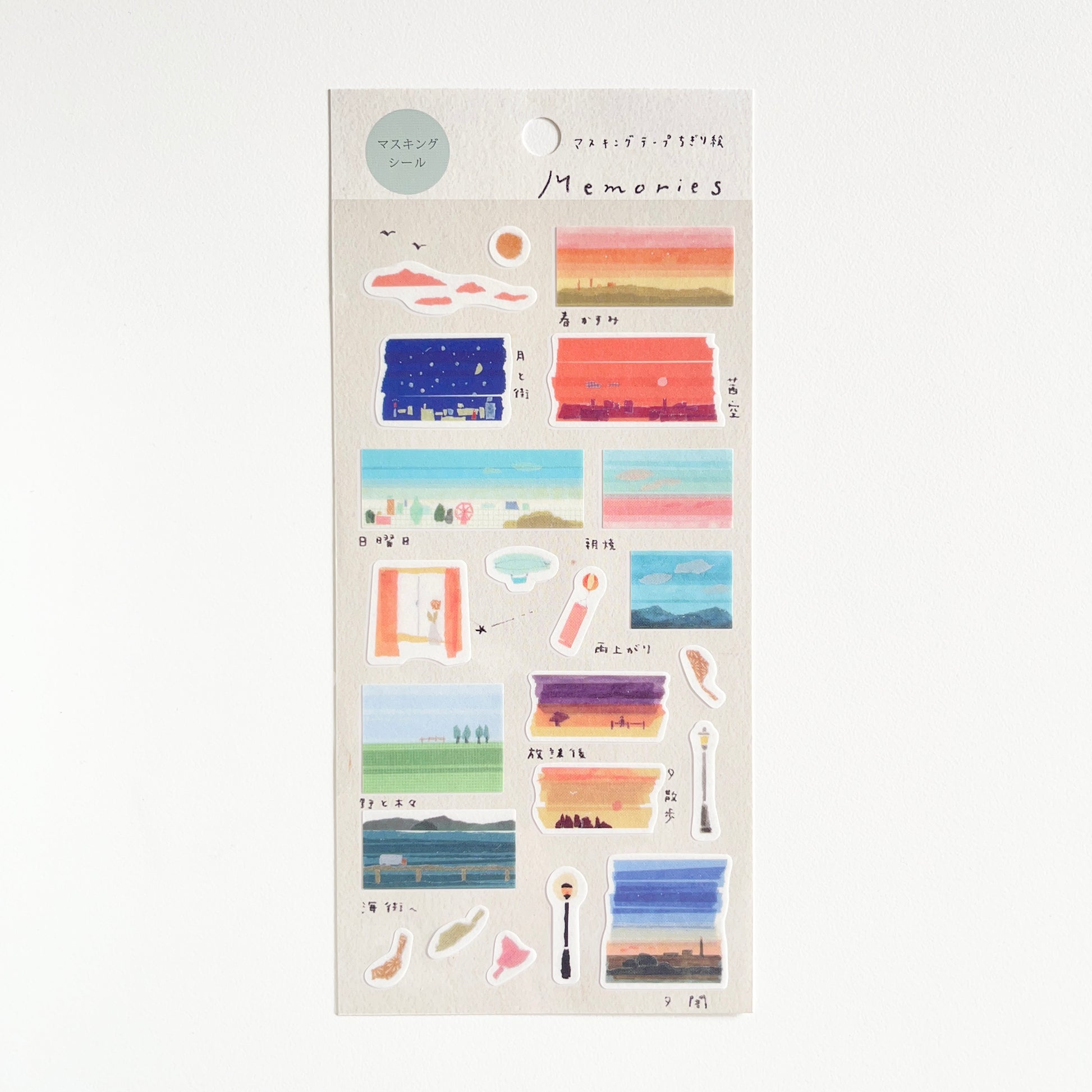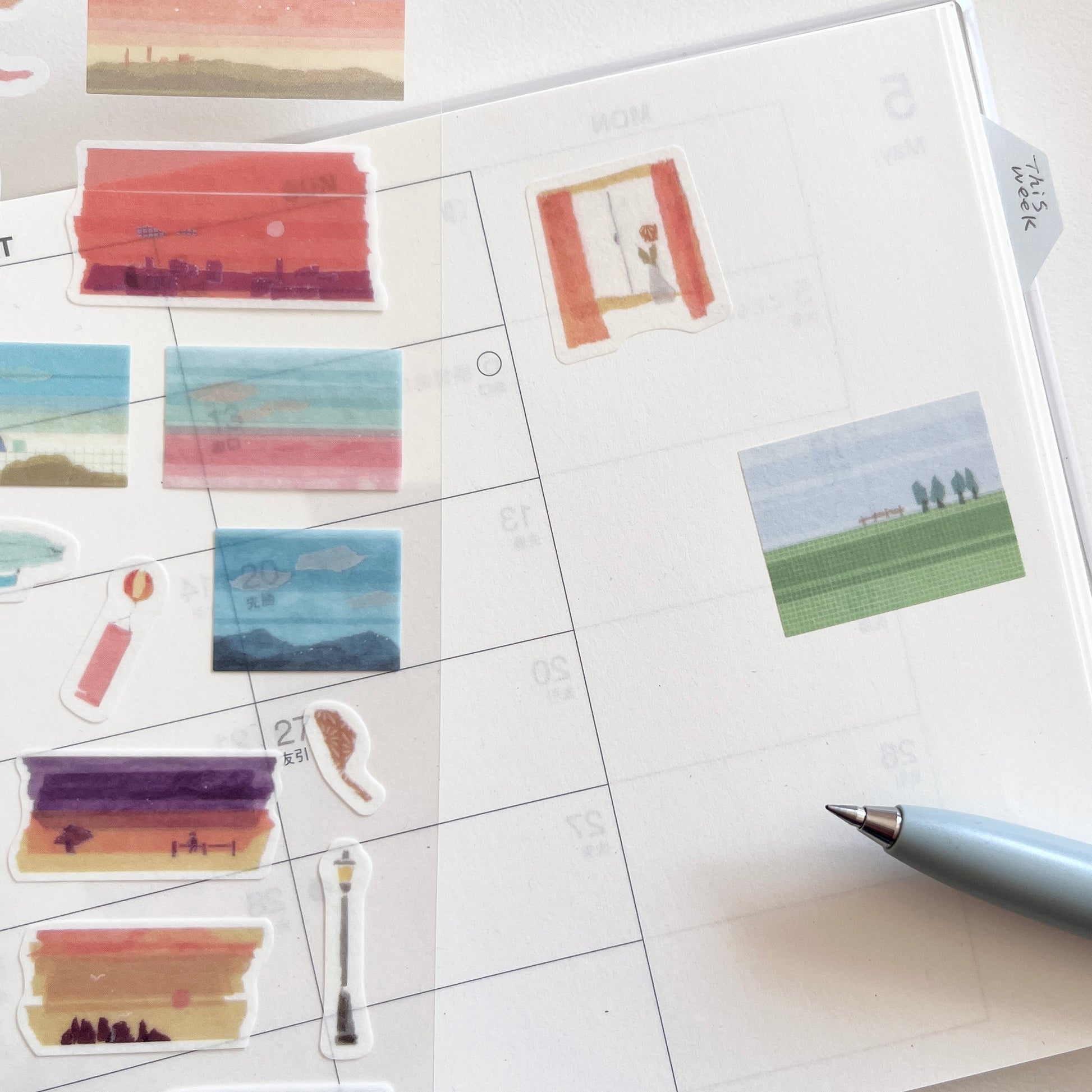This sheet captures fleeting landscapes such as spring haze, red-tinged skies, the moon over town, twilight moments and so on. Like memories caught on paper, the designs invite quiet reflection. Made from washi masking tape, the stickers blend beautifully into your journal or collage.