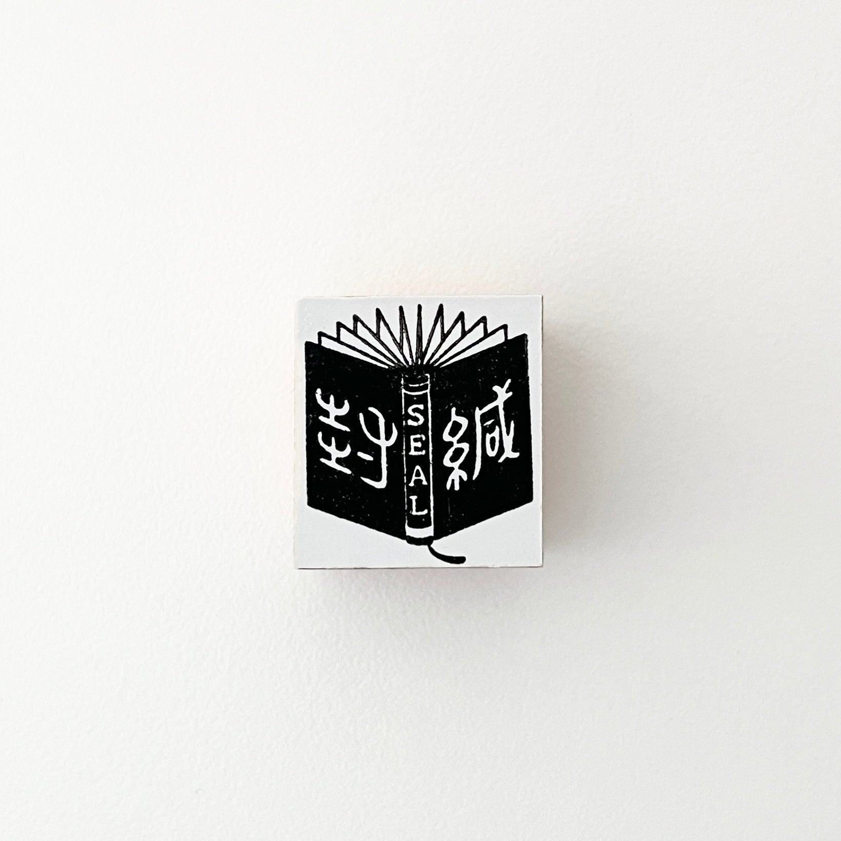 A sealing stamp in the shape of an open book—its spine stamped with the word “SEAL” and the kanji for sealing (封緘) on the covers. The slightly retro design feels like something from an old library, adding a quiet charm wherever you stamp it.