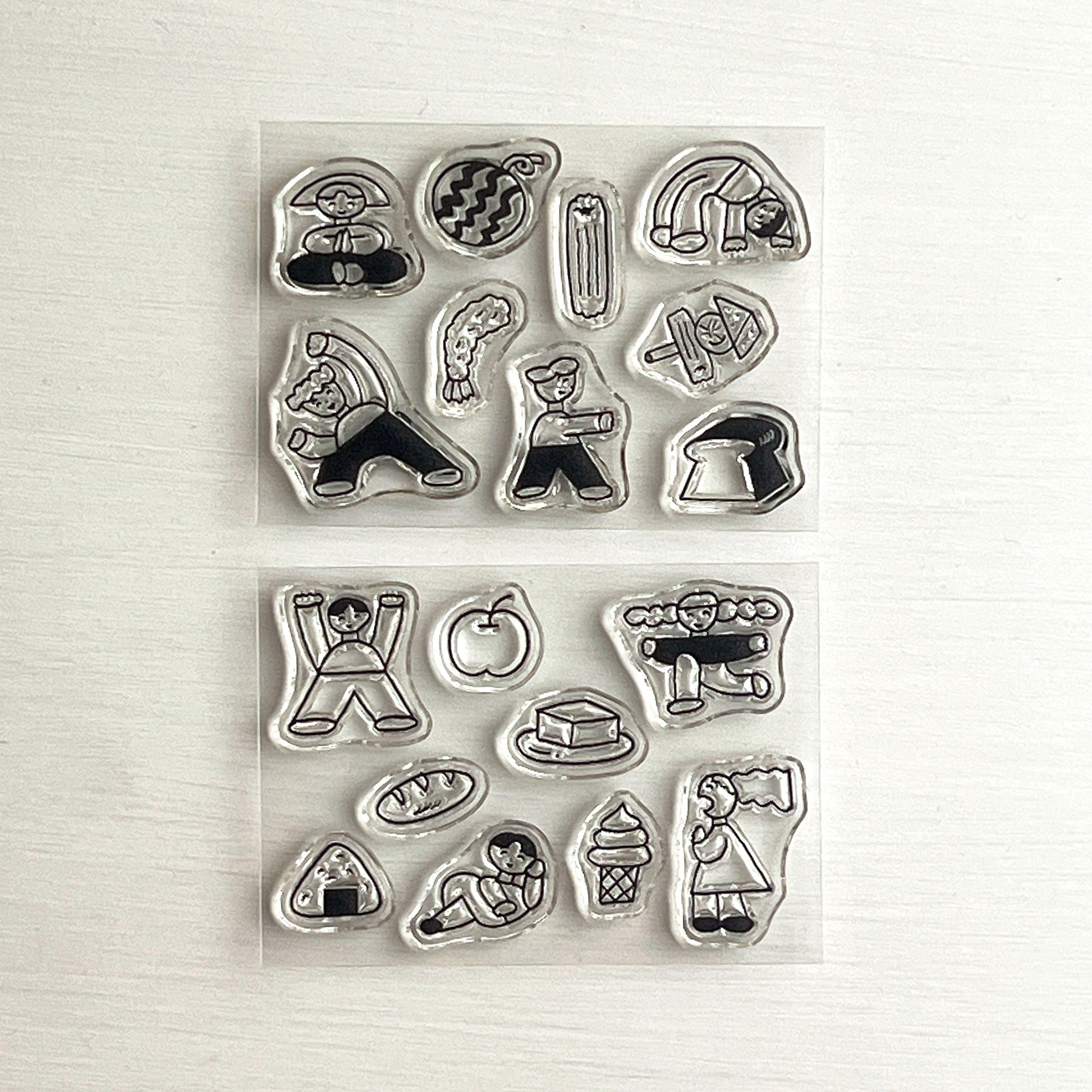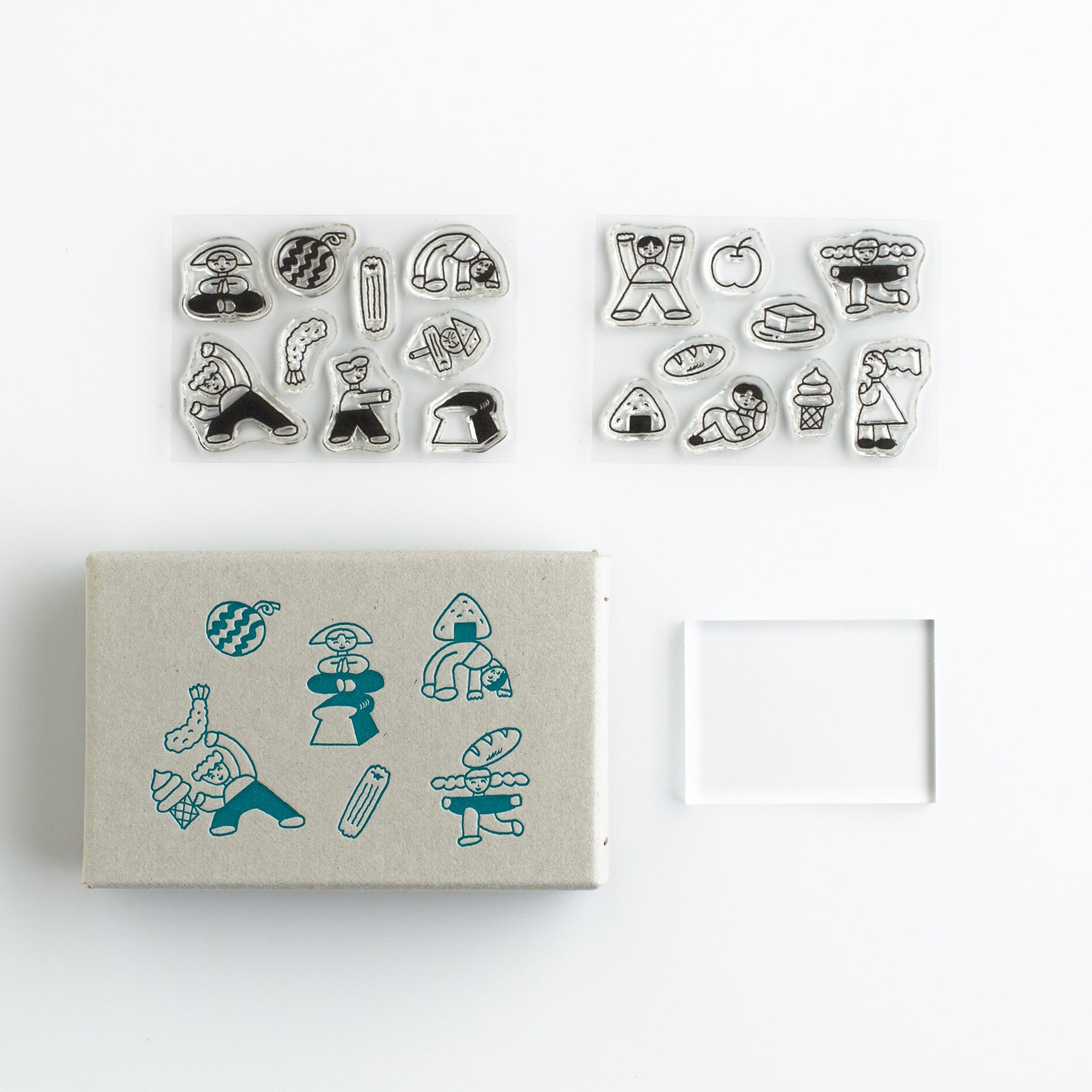 A playful clear stamp set designed by illustrator Tadashi Nishiwaki, filled with quirky characters and charming food motifs. From wobbly poses to favorite snacks—each stamp captures a little moment of joy and silliness.